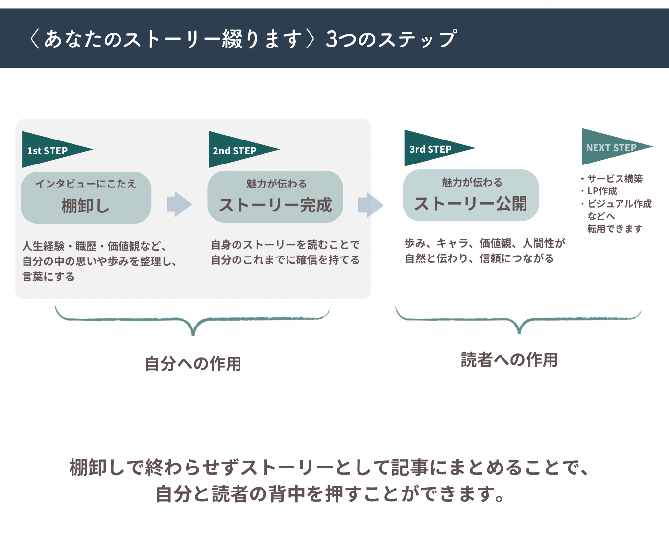 インタビューを通じて思いを引き出し、伝えたいことを整理し、プロフィール・SNS・クラファン・LPなどへ実装するサポートを行う。
